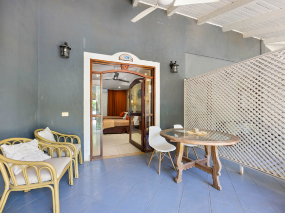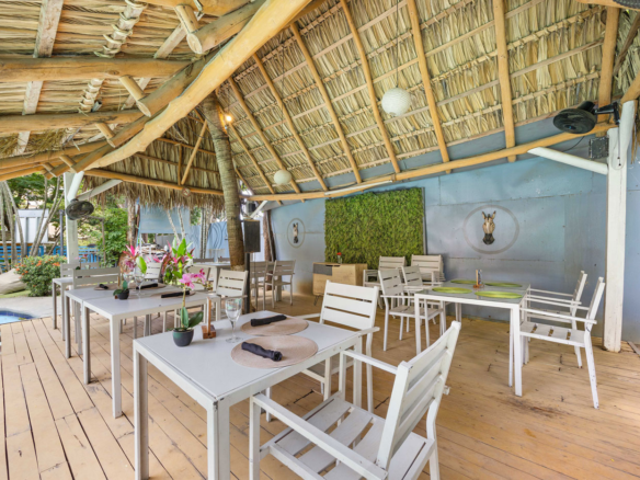 Guests are welcomed into a laid-back bohemian atmosphere featuring a stunning open-air lounge overlooking the tropical gardens. With its natural bamboo ceilings, rustic wood floors, and cozy seating, this space invites relaxation—perfect for morning coffee, sunset cocktails, or movie nights under the stars.