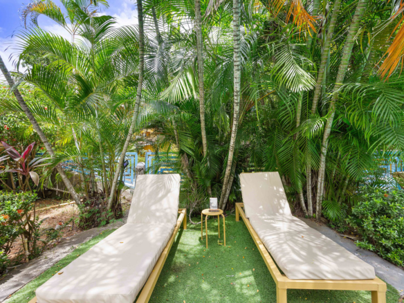 At the heart of the property lies a refreshing pool surrounded by lush gardens and a shaded palapa lounge. Whether guests are sunbathing, dining al fresco, or unwinding with a drink, the tropical ambiance makes every moment unforgettable.