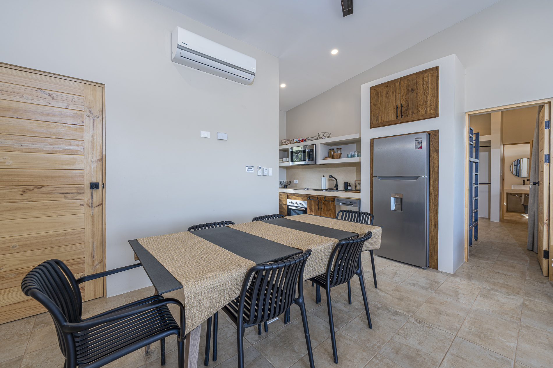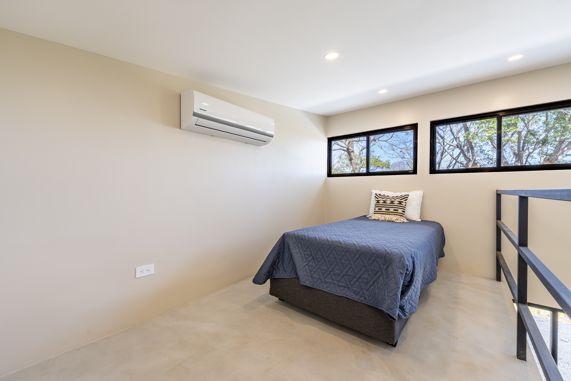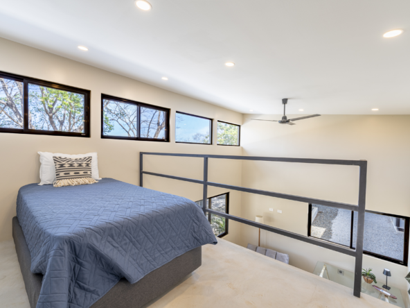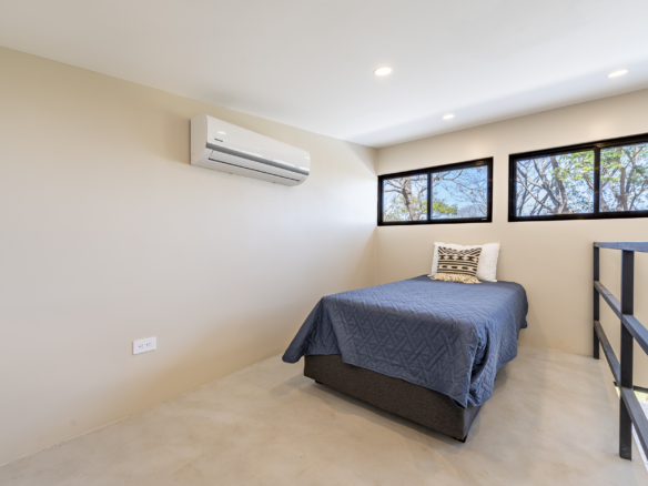 This beautiful home is set on a generous 2-acre lot. The main residence features two bedrooms, each with its own ensuite bathroom. Both rooms offer stunning views of the pool and treetops, thanks to the home’s elevated position on the property. One bedroom serves as the master, while the other is designed as a guest room, furnished with a bunk bed and a single bed.