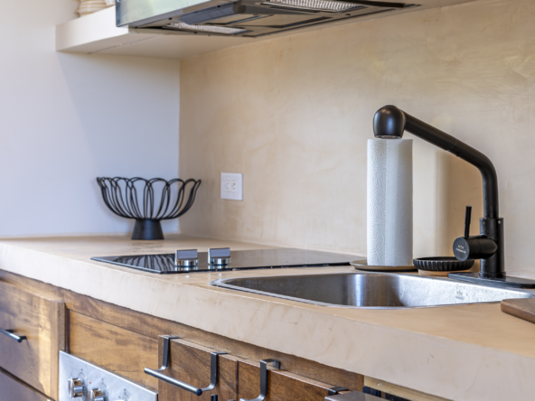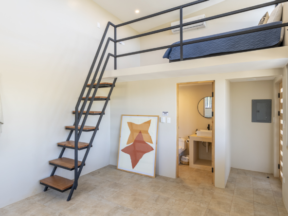 Also located on the property is a cozy studio apartment. On the ground floor, you’ll find a small living room area with a bathroom, a desk, and a couch. A set of stairs leads up to a charming mezzanine level where the bed is located.