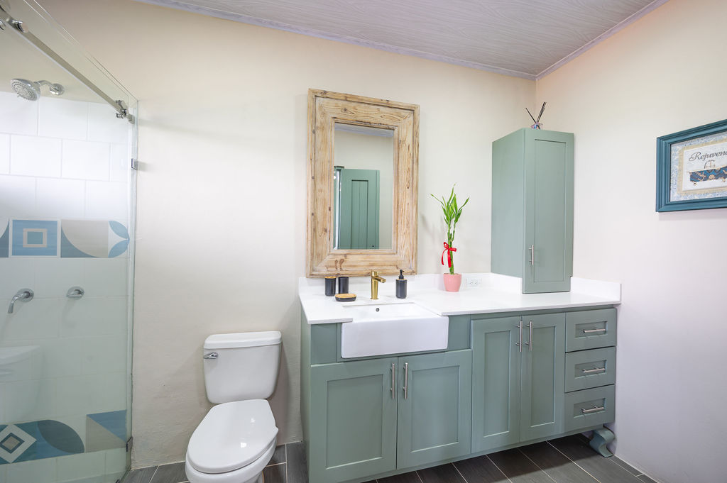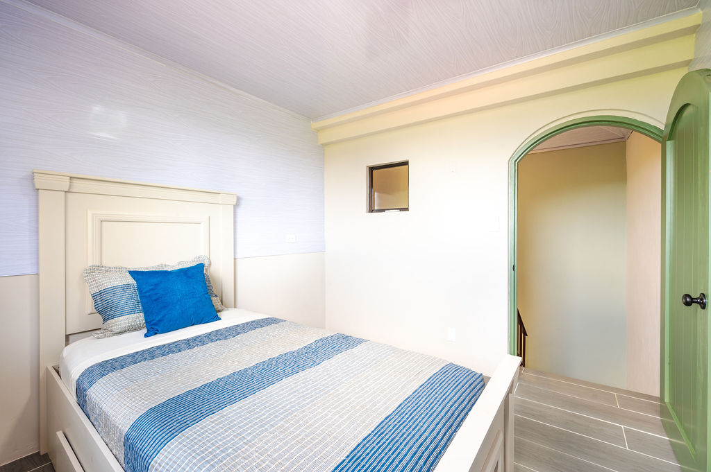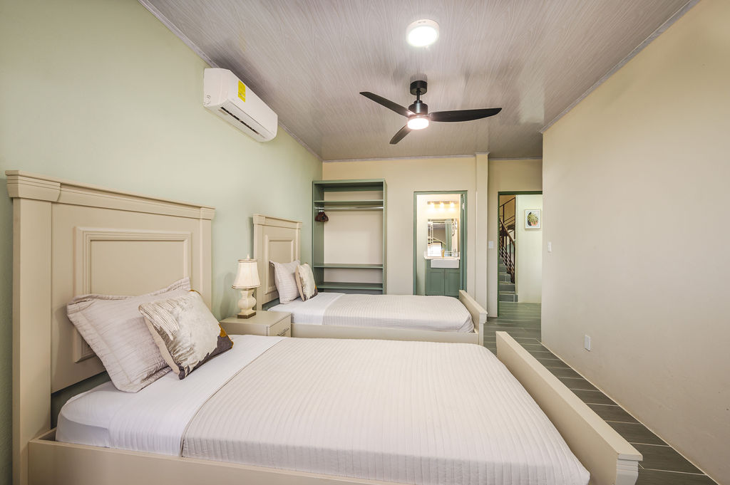 The guest bedroom offers two full beds, a closet, and its own private bathroom.