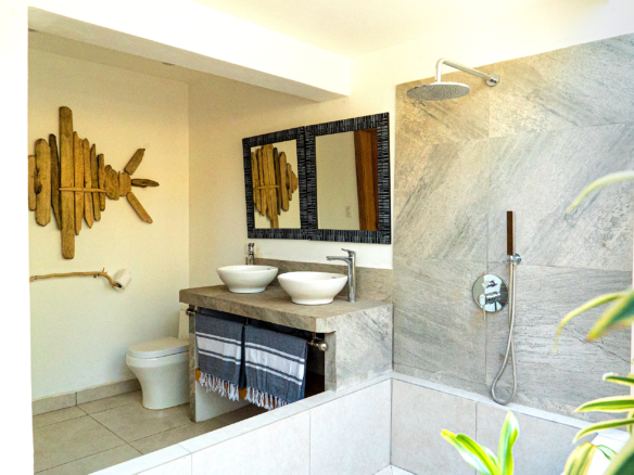 On the lower level, you’ll find a private guest suite with an outdoor bathroom, while the upper floor hosts two additional bedrooms and access to the spectacular rooftop terrace. From here, enjoy breathtaking panoramic views of the forest canopy and ocean horizon, evoking the sensation of being on a luxurious cruise at sea.