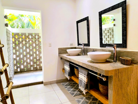 Spanning 420 m² of beautifully crafted space, the home features four elegant bedrooms, each with its own ensuite bathroom and outdoor shower that opens to private terraces and gardens. Every detail has been thoughtfully designed to create a seamless flow between indoor comfort and the surrounding nature.