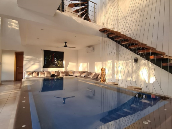 The main floor offers a spacious open-concept living area with a fully equipped modern kitchen, dining area, and lounge featuring a billiard table—perfect for entertaining. Large glass doors lead to a covered terrace overlooking the infinity-edge pool and tropical gardens, offering an ideal setting for year-round outdoor living.