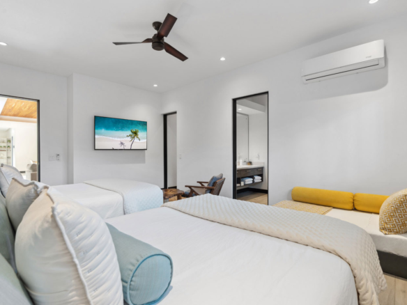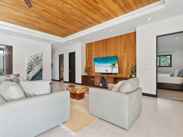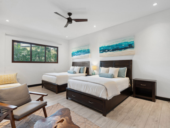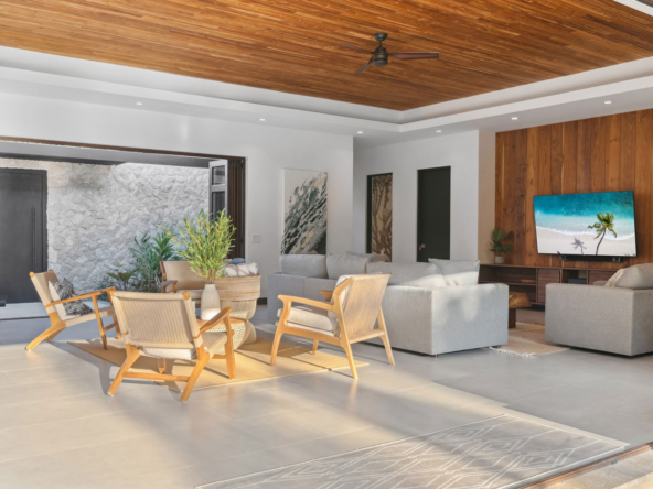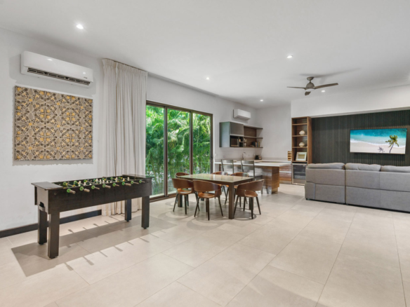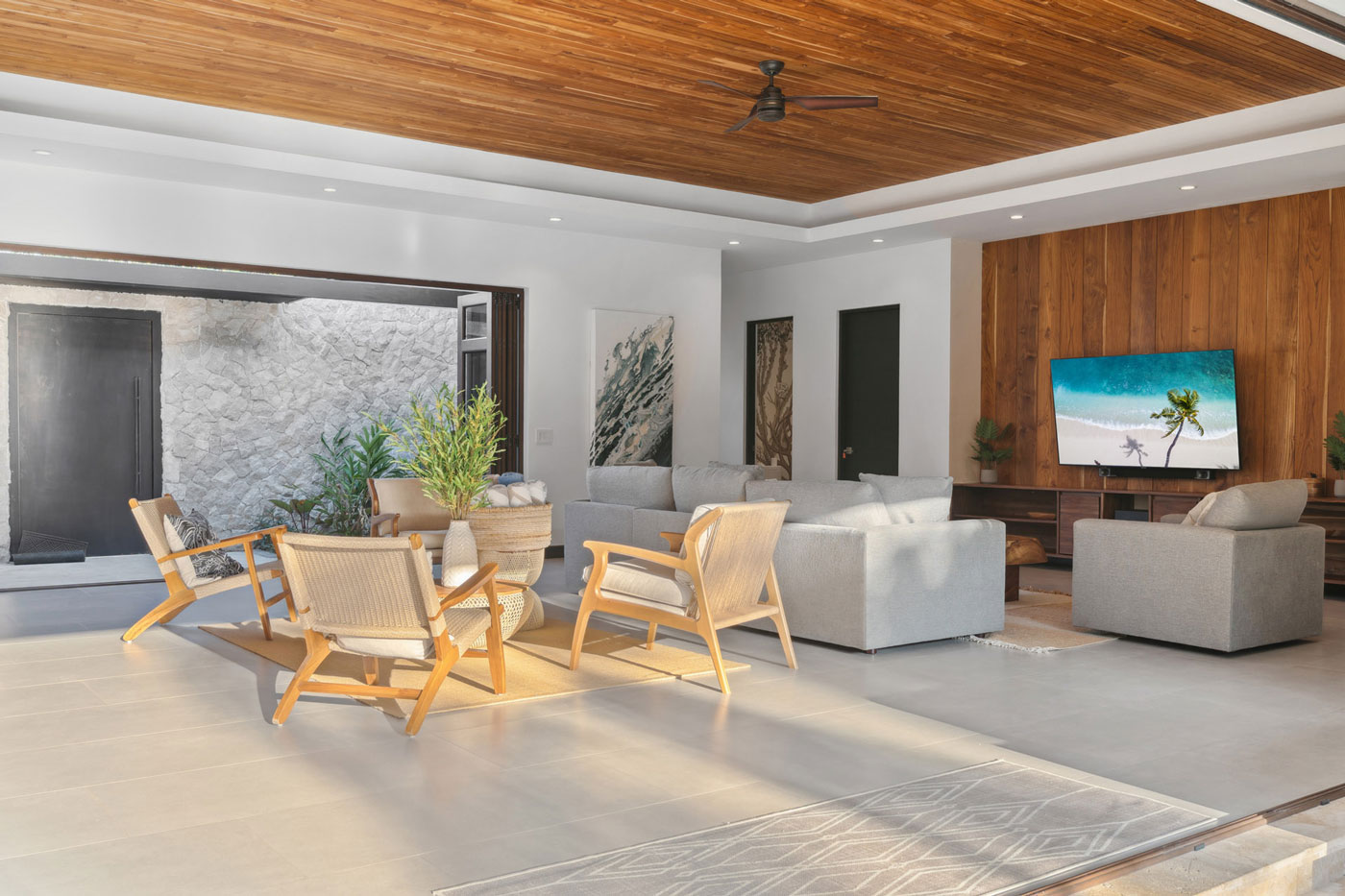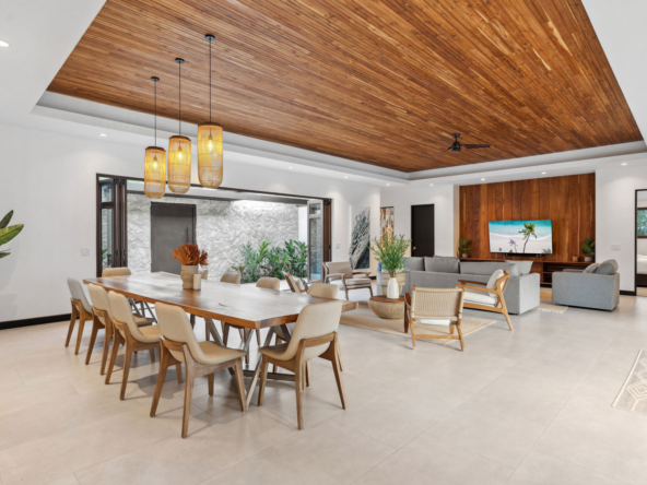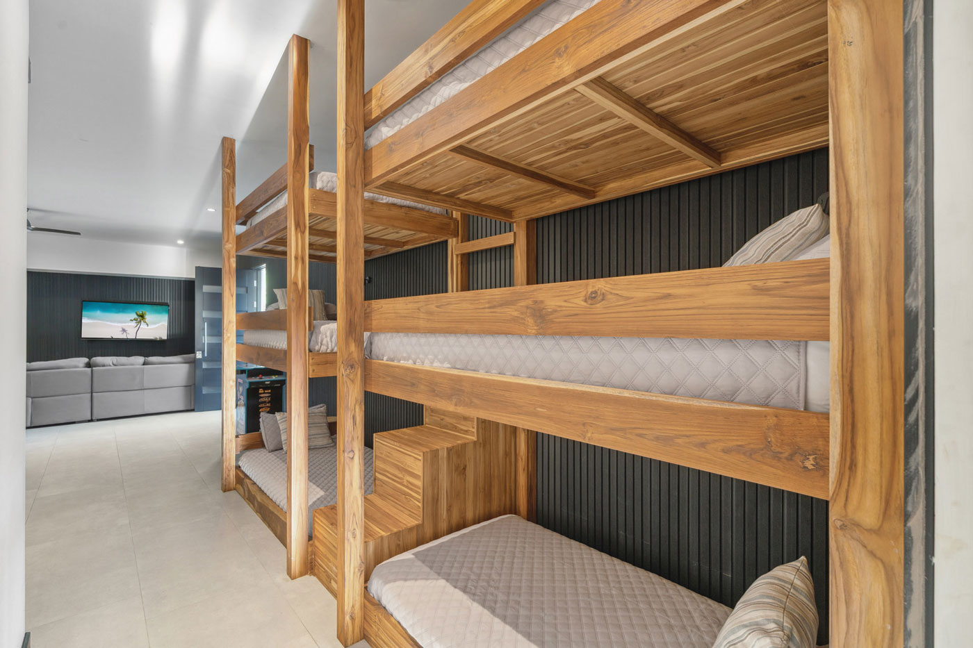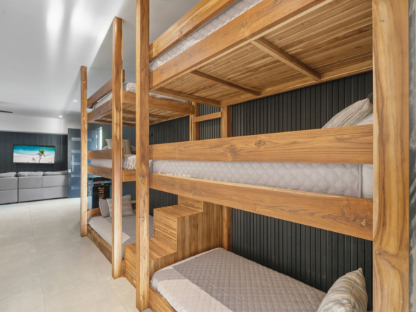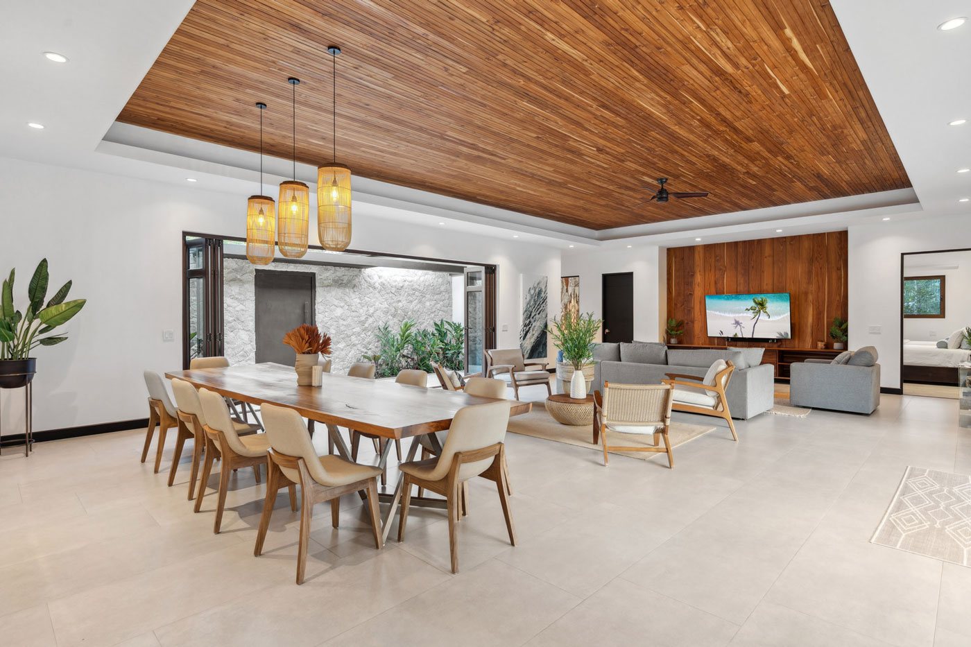 The heart of the home is a spectacular open-concept living and dining area, framed by teak-inlaid ceilings, soft golden lighting, and panoramic views over the crystal-blue pool and lush gardens. A chef’s kitchen with professional-grade appliances and seamless indoor-outdoor access makes entertaining effortless. With five expansive bedrooms, including a private bunkhouse retreat, the property can host up to 16 guests—ideal for wellness groups, retreats, or extended family gatherings. The primary suite offers spa-like luxury, while the separate bunkhouse creates the ultimate private kids’ or group escape.