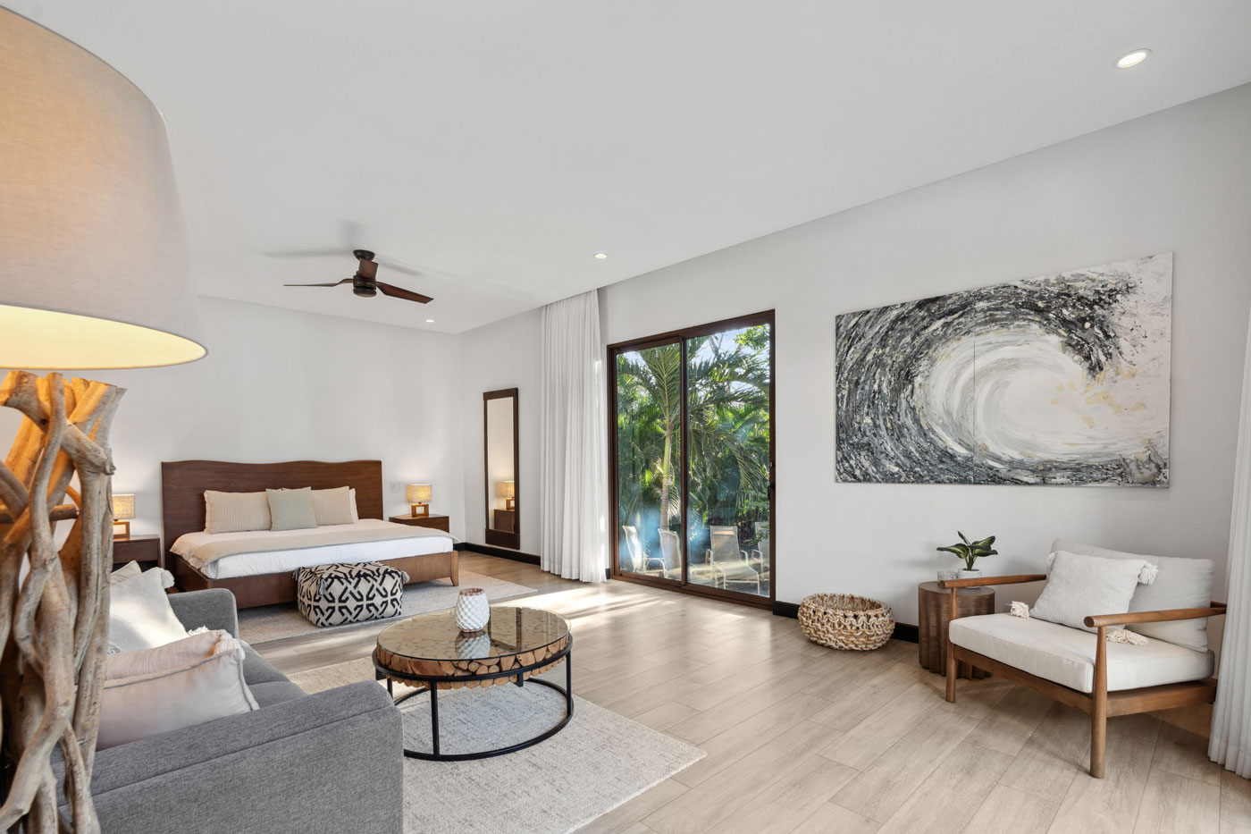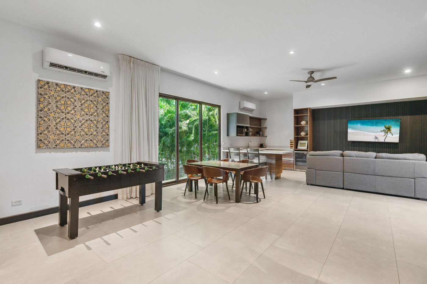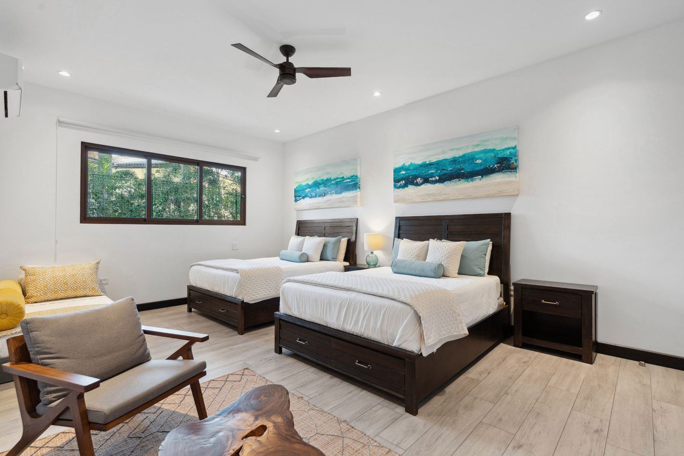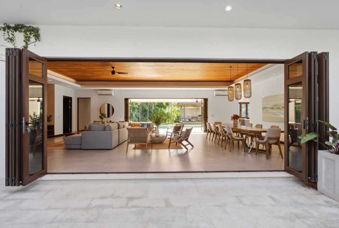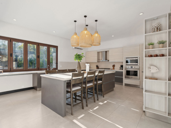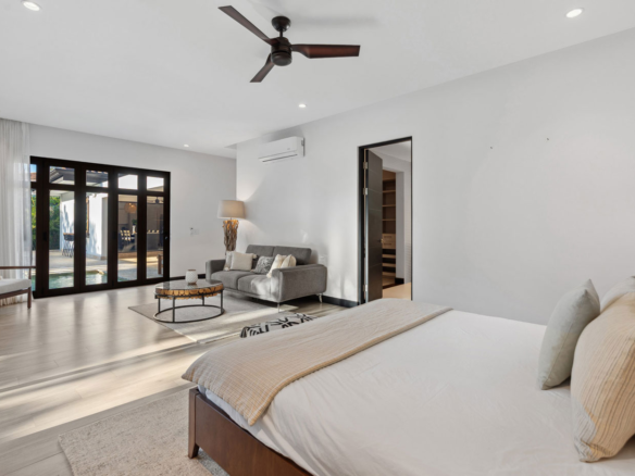 The heart of the home is a spectacular open-concept living and dining area, framed by teak-inlaid ceilings, soft golden lighting, and panoramic views over the crystal-blue pool and lush gardens. A chef’s kitchen with professional-grade appliances and seamless indoor-outdoor access makes entertaining effortless. With five expansive bedrooms, including a private bunkhouse retreat, the property can host up to 16 guests—ideal for wellness groups, retreats, or extended family gatherings. The primary suite offers spa-like luxury, while the separate bunkhouse creates the ultimate private kids’ or group escape.