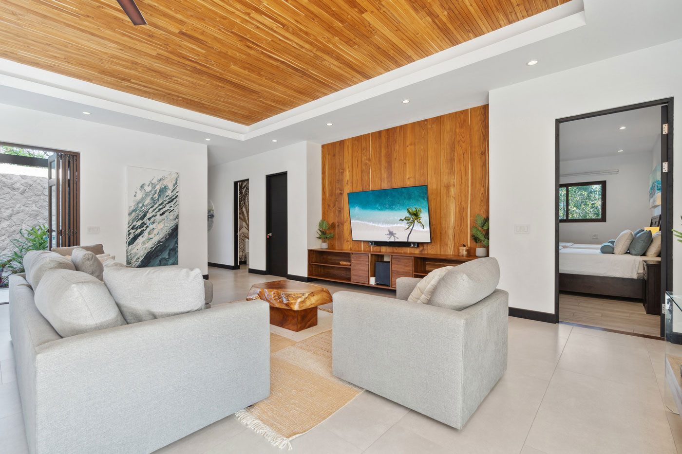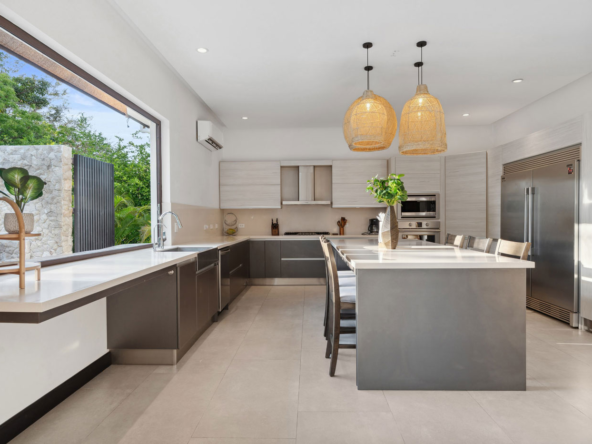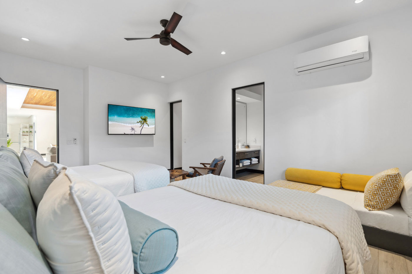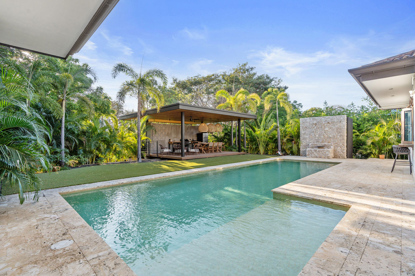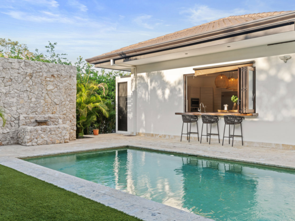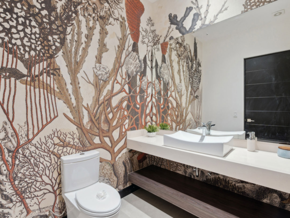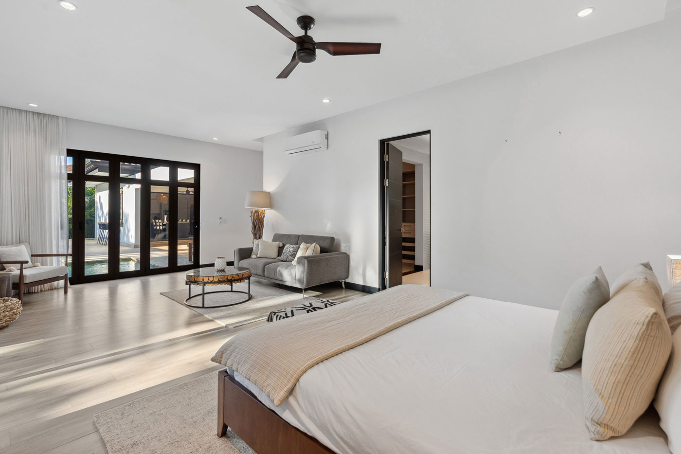The heart of the home is a spectacular open-concept living and dining area, framed by teak-inlaid ceilings, soft golden lighting, and panoramic views over the crystal-blue pool and lush gardens. A chef’s kitchen with professional-grade appliances and seamless indoor-outdoor access makes entertaining effortless. With five expansive bedrooms, including a private bunkhouse retreat, the property can host up to 16 guests—ideal for wellness groups, retreats, or extended family gatherings. The primary suite offers spa-like luxury, while the separate bunkhouse creates the ultimate private kids’ or group escape.