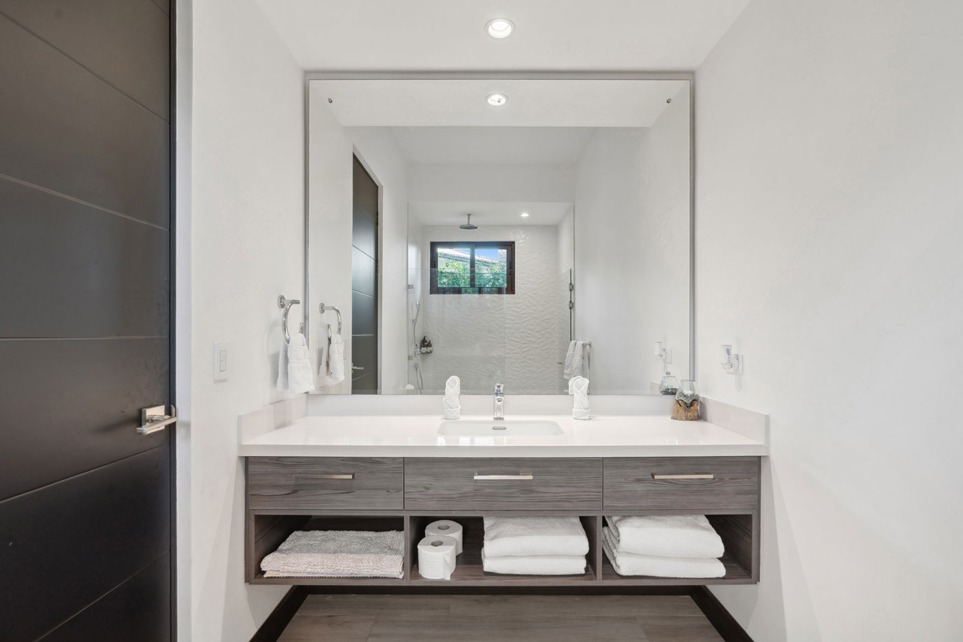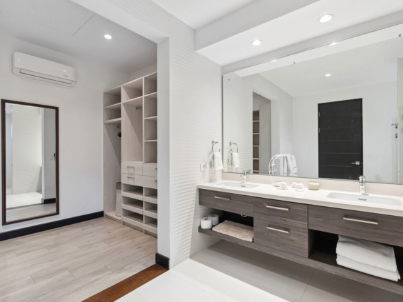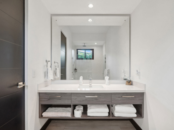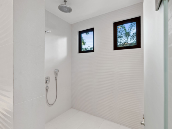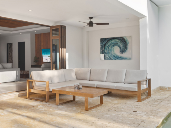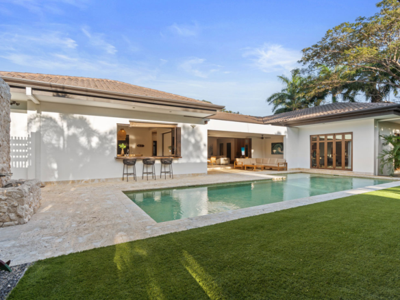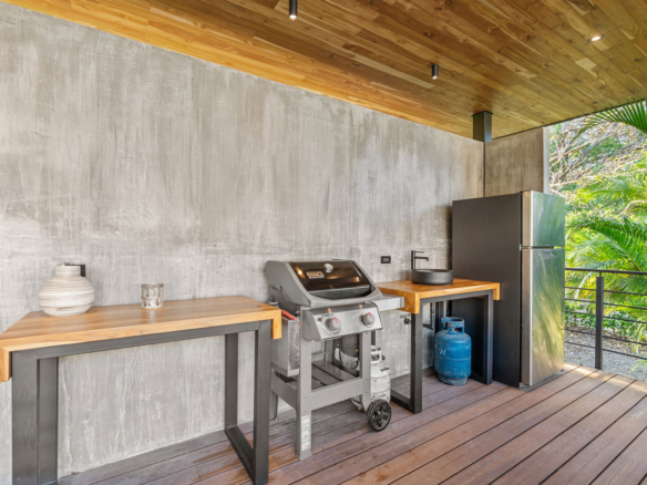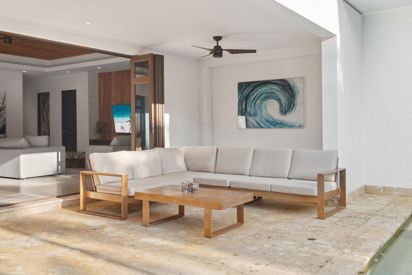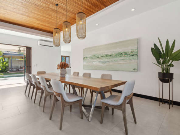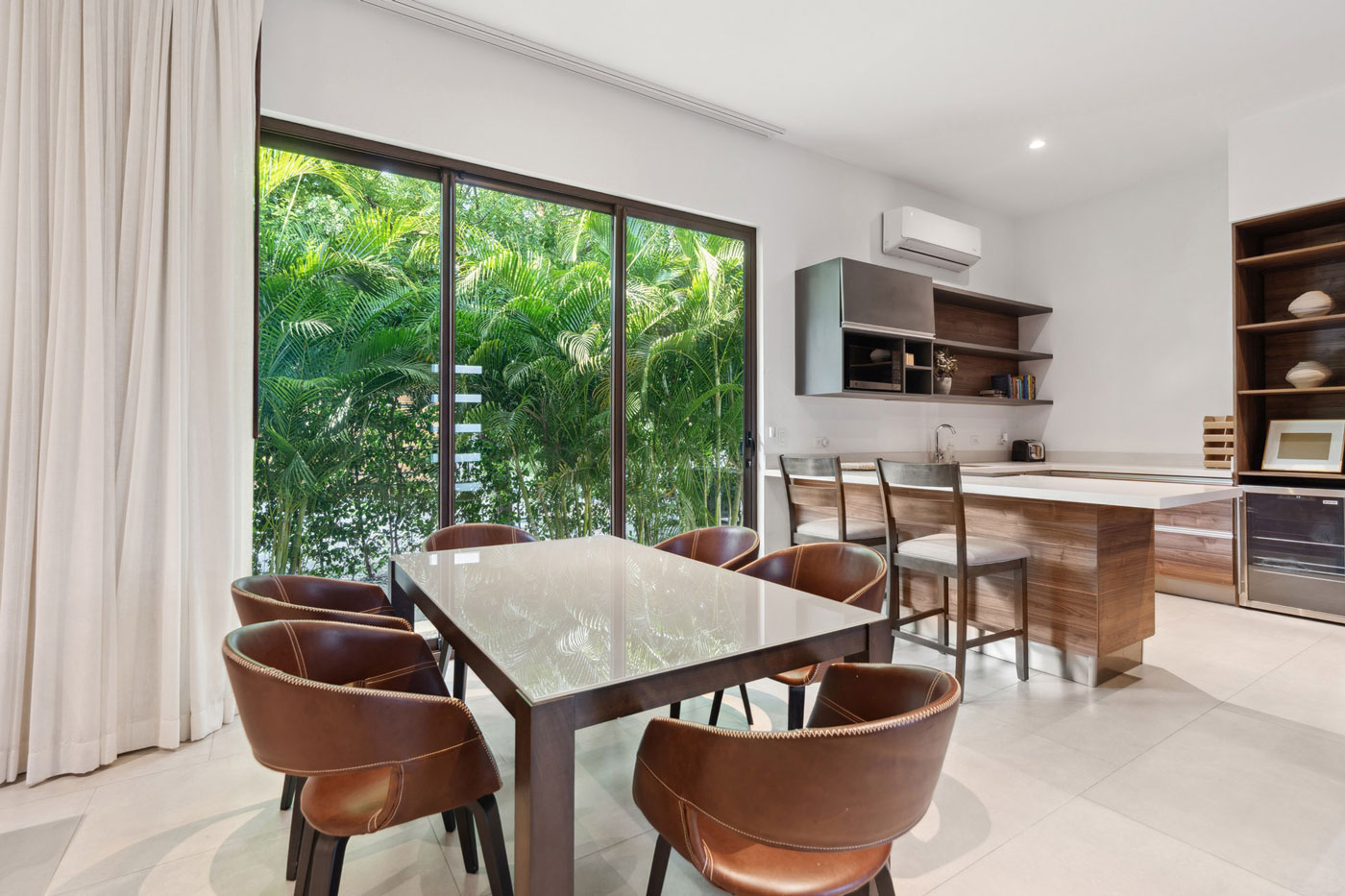 The heart of the home is a spectacular open-concept living and dining area, framed by teak-inlaid ceilings, soft golden lighting, and panoramic views over the crystal-blue pool and lush gardens. A chef’s kitchen with professional-grade appliances and seamless indoor-outdoor access makes entertaining effortless. With five expansive bedrooms, including a private bunkhouse retreat, the property can host up to 16 guests—ideal for wellness groups, retreats, or extended family gatherings. The primary suite offers spa-like luxury, while the separate bunkhouse creates the ultimate private kids’ or group escape.