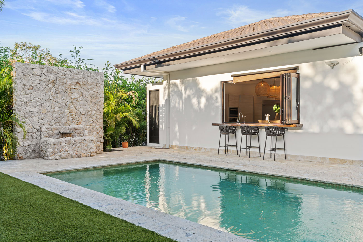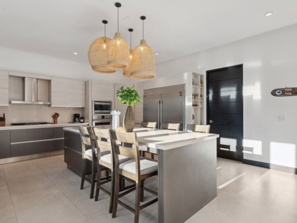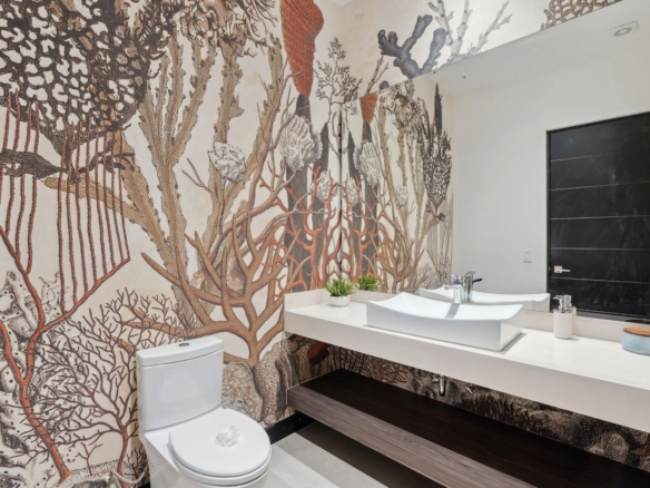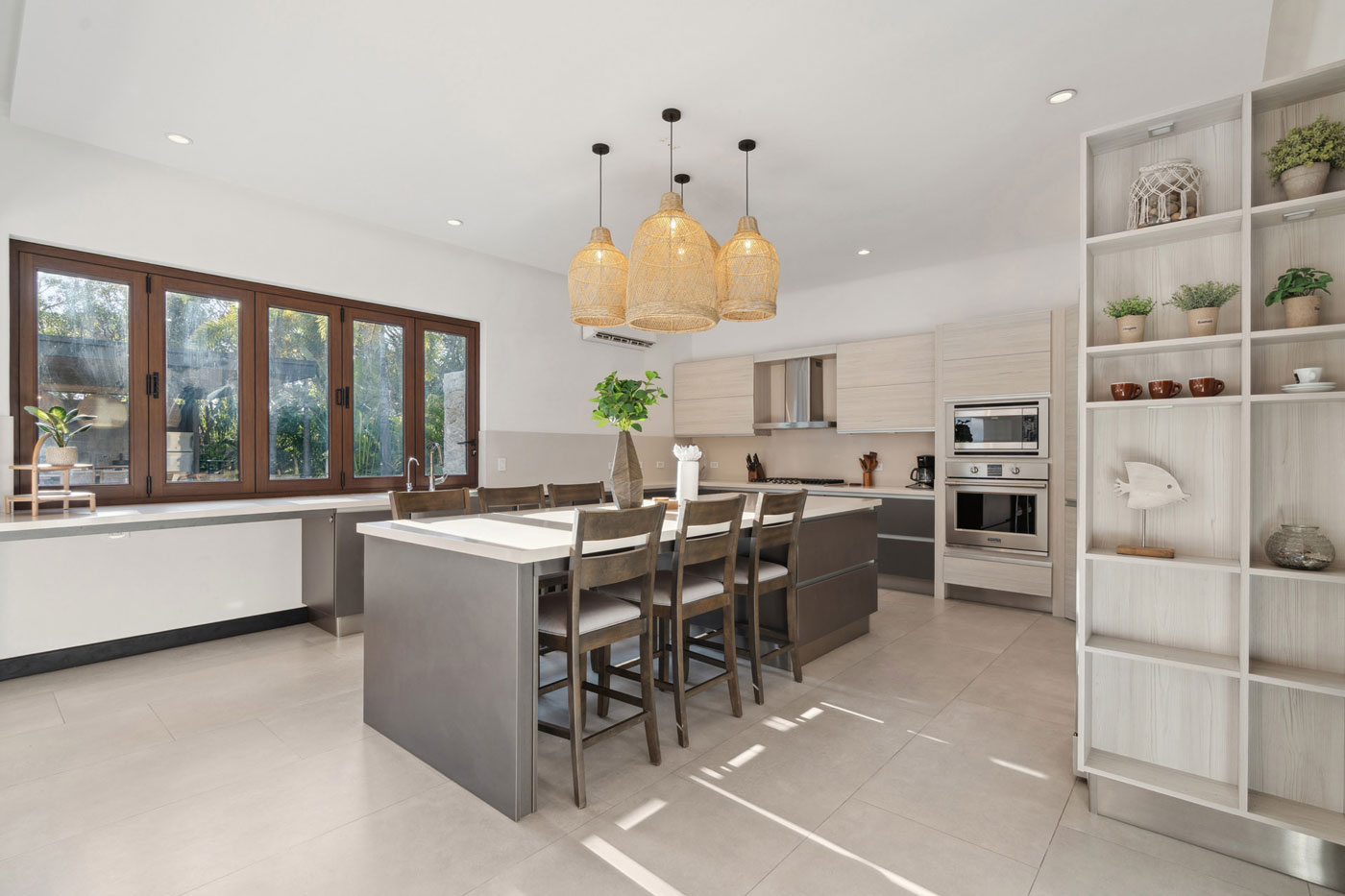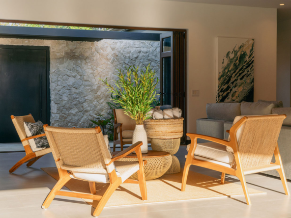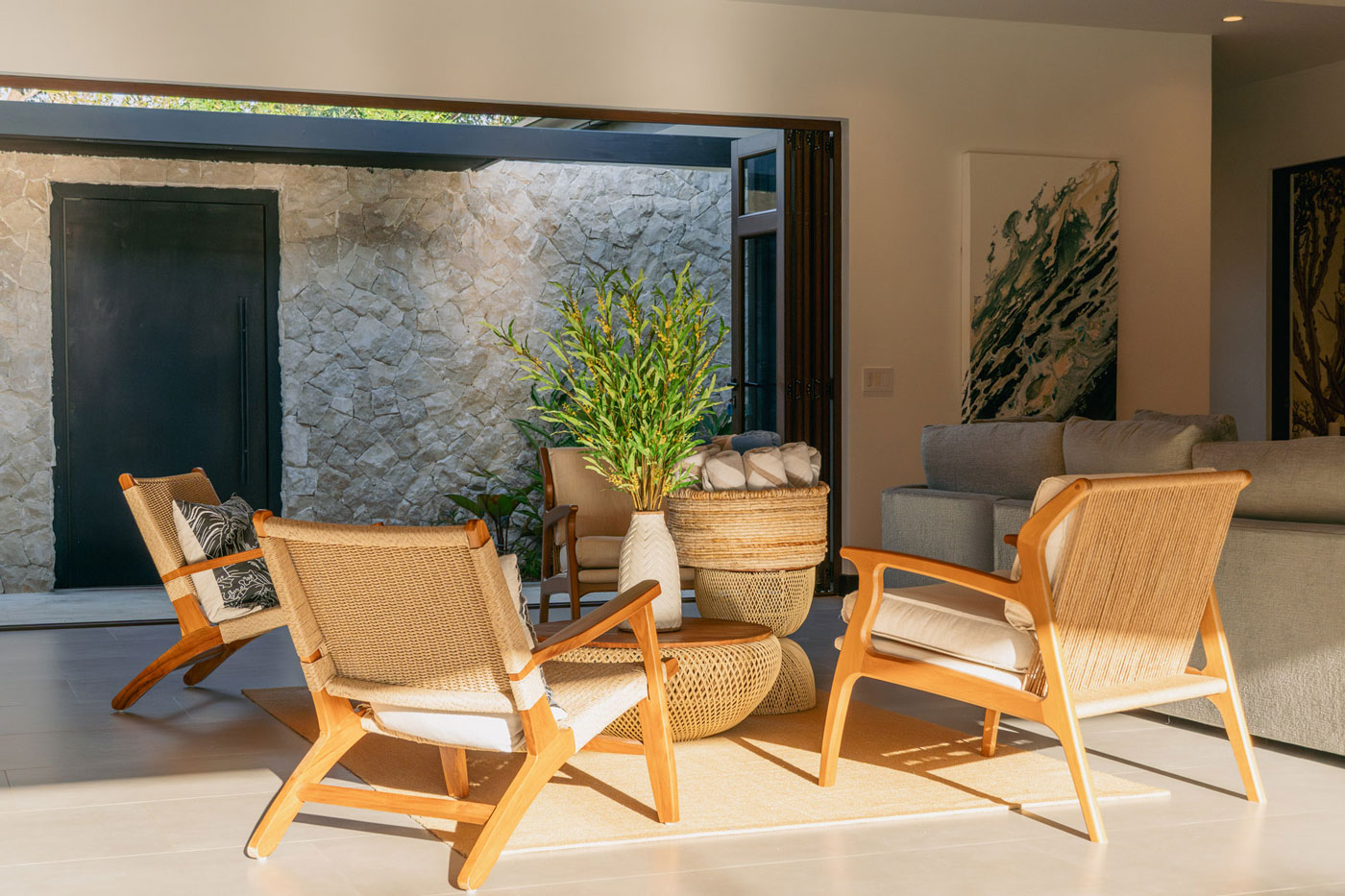 Set behind a private white stone entry wall, the retreat welcomes you with a lushly landscaped courtyard, where the gentle sounds of water immediately transport you into a state of serenity. These soothing elements carry through the property, with 30-foot bi-folding doors opening to invite ocean breezes and natural light.