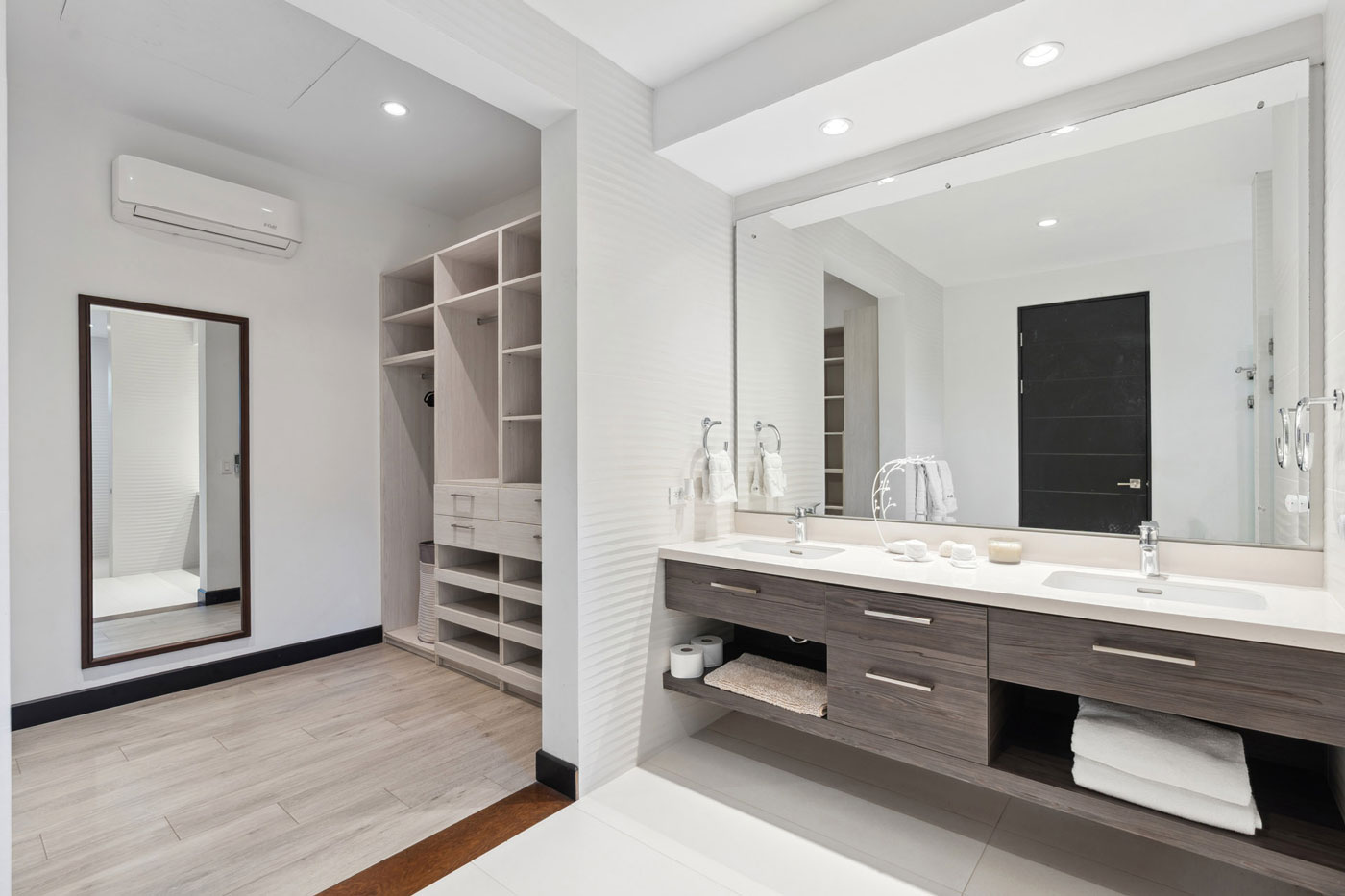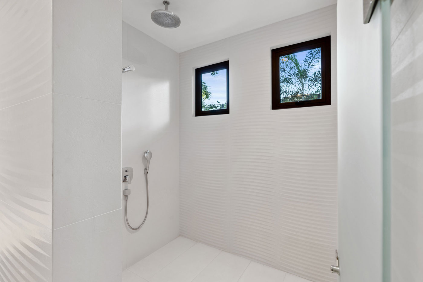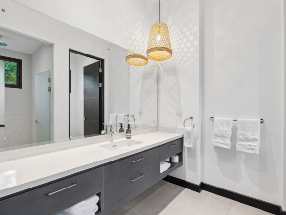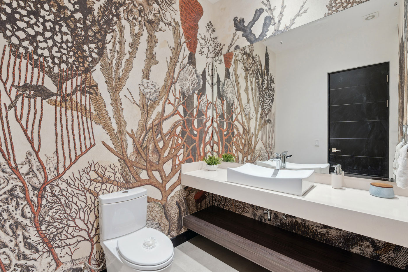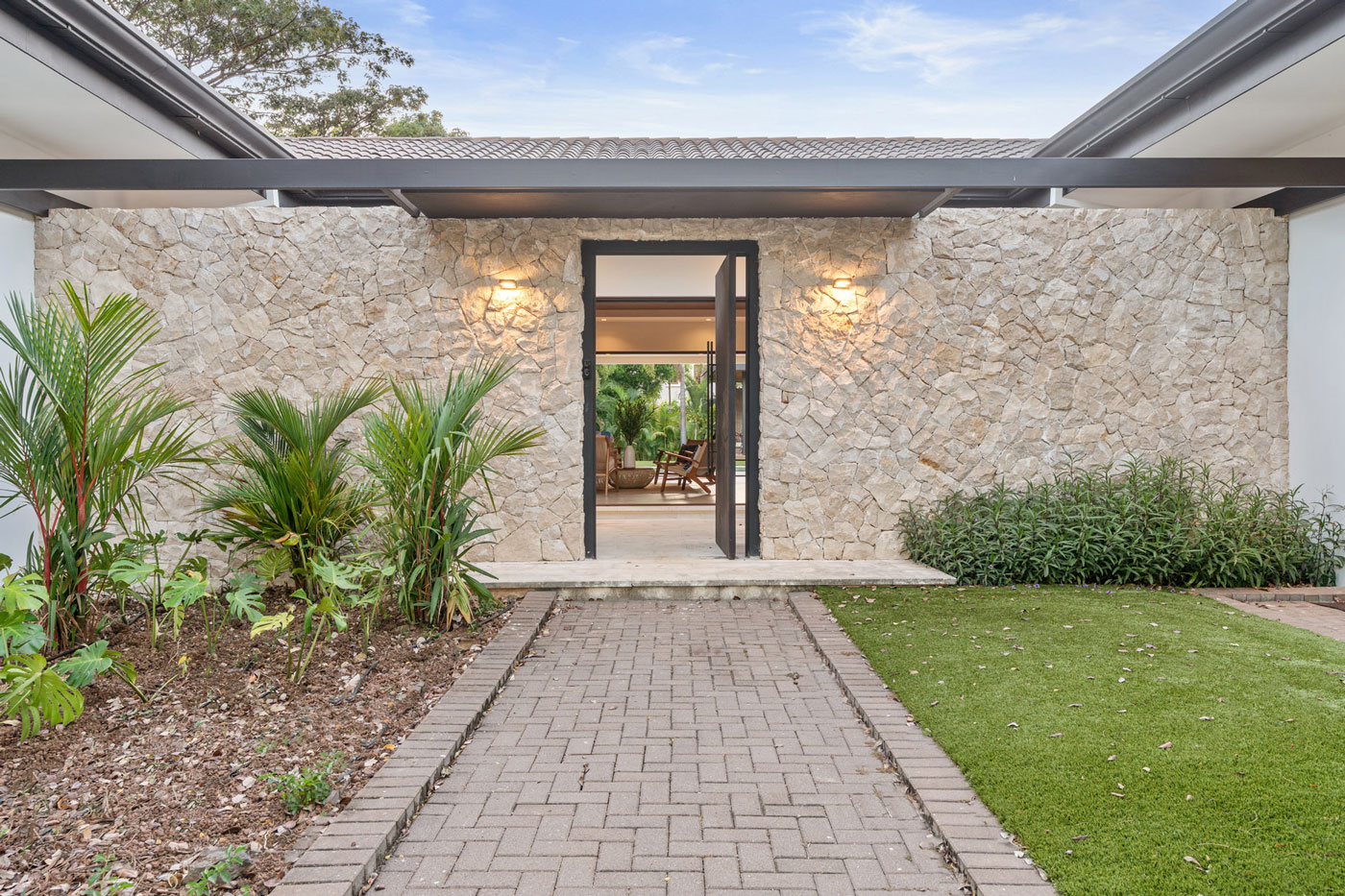 Set behind a private white stone entry wall, the retreat welcomes you with a lushly landscaped courtyard, where the gentle sounds of water immediately transport you into a state of serenity. These soothing elements carry through the property, with 30-foot bi-folding doors opening to invite ocean breezes and natural light.