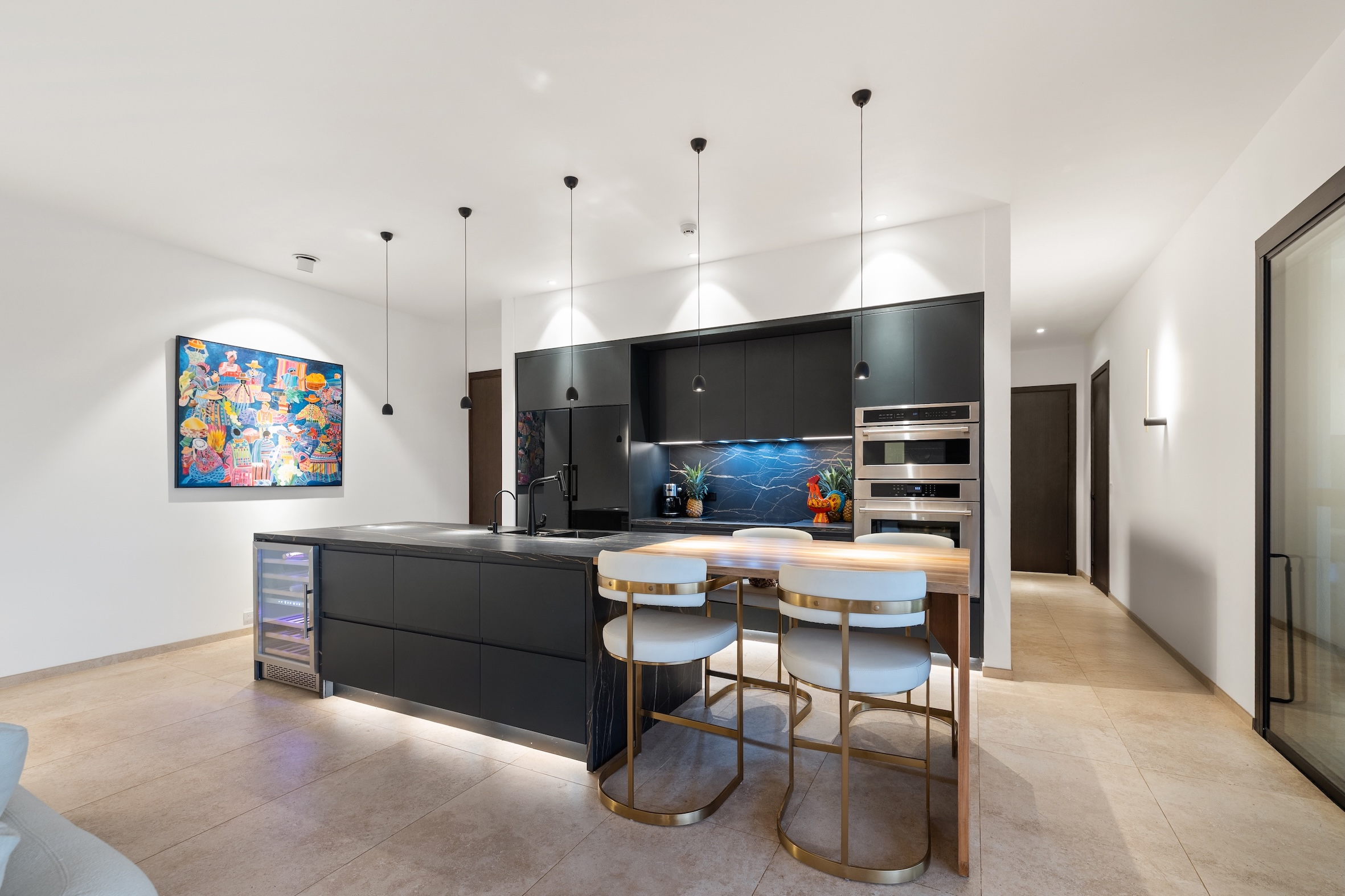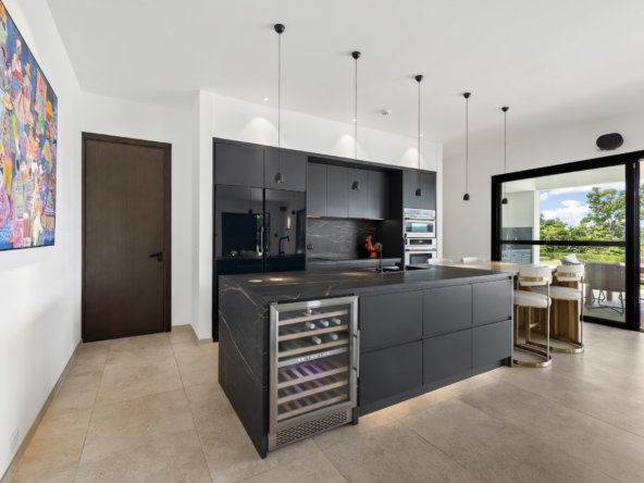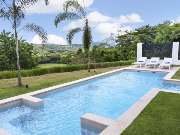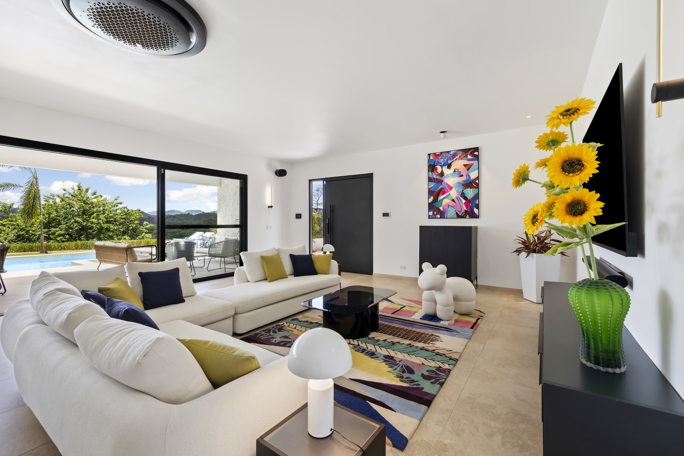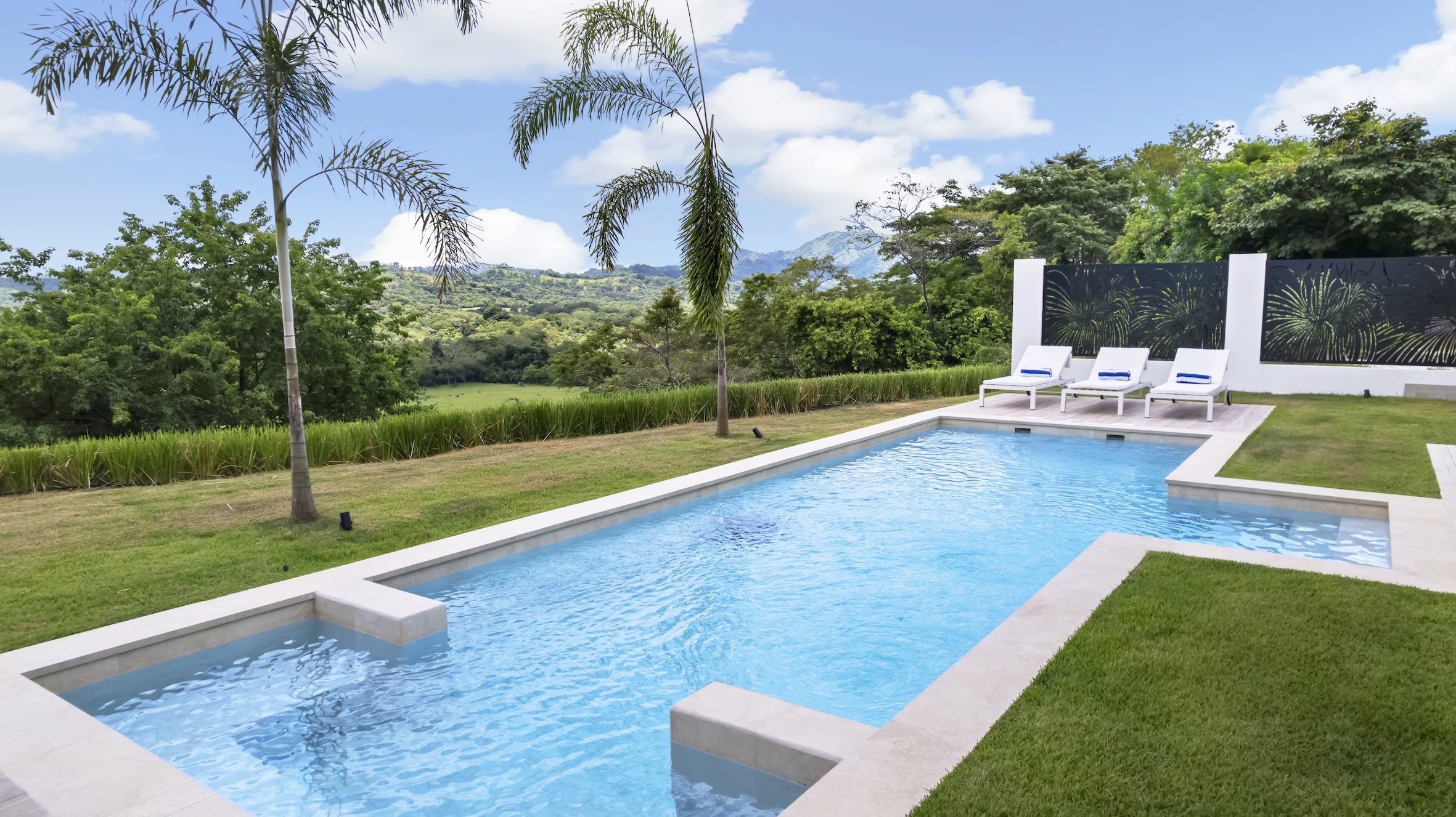 A private 3BR/3.5BA sanctuary where European Sophistication meets tropical living. Spanning 2,745 sq ft (255 m²) on an 850 m² lot, this contemporary hillside residence features an open-concept design with expansive glass doors flowing to a large terrace, 323 sq ft saltwater pool with jacuzzi, and panoramic valley views.